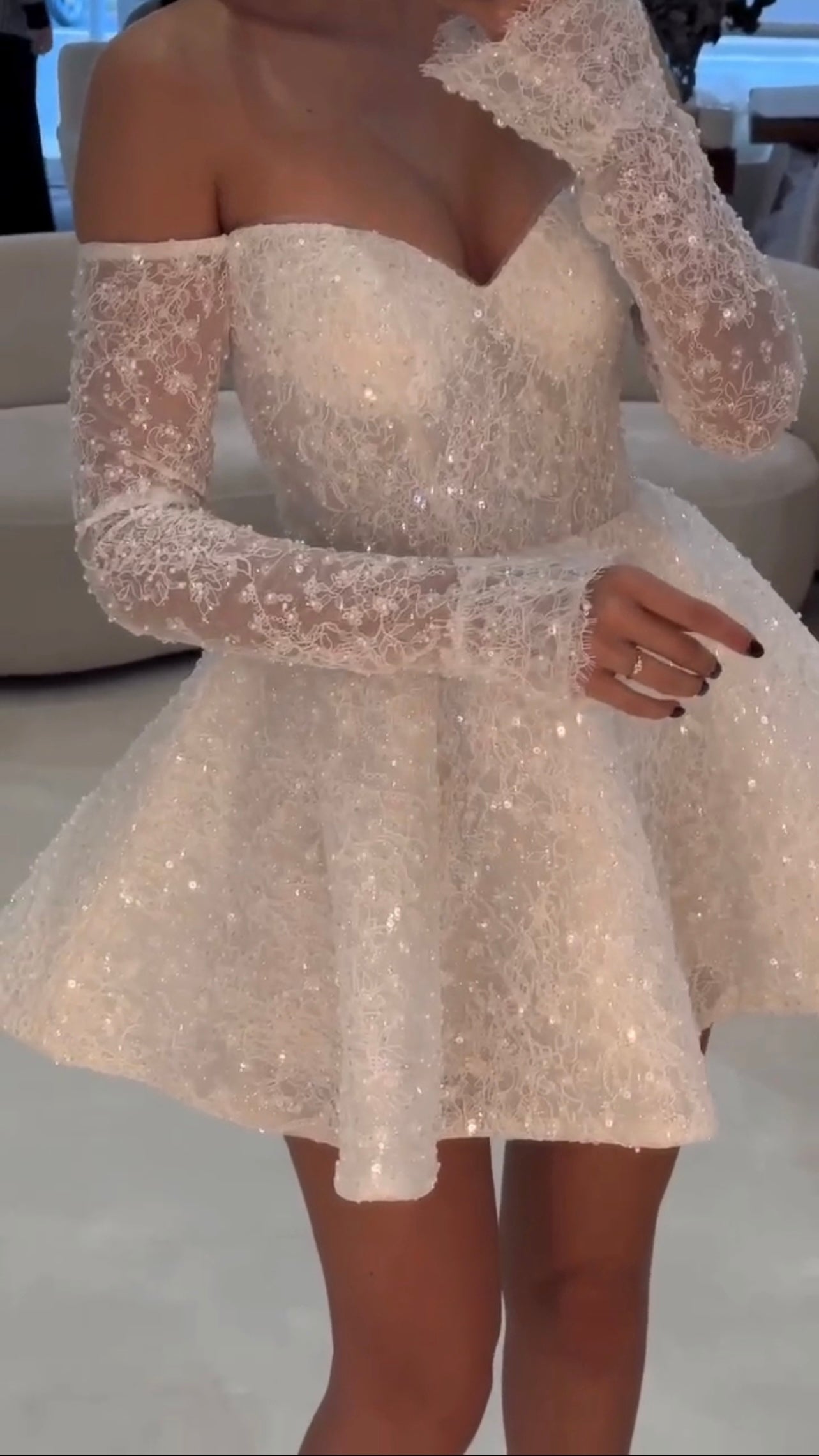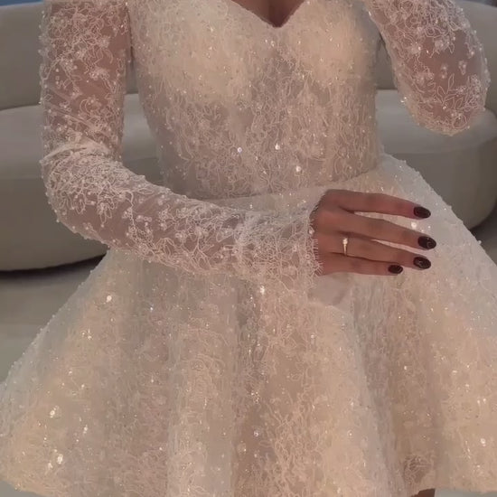 Sparkle your way down the aisle in our Roma-Mini wedding dress. This luxury dress is sure to turn heads with its dazzling details and mini length. Perfect for a playful and unconventional bride looking to add a touch of glam to her special day.